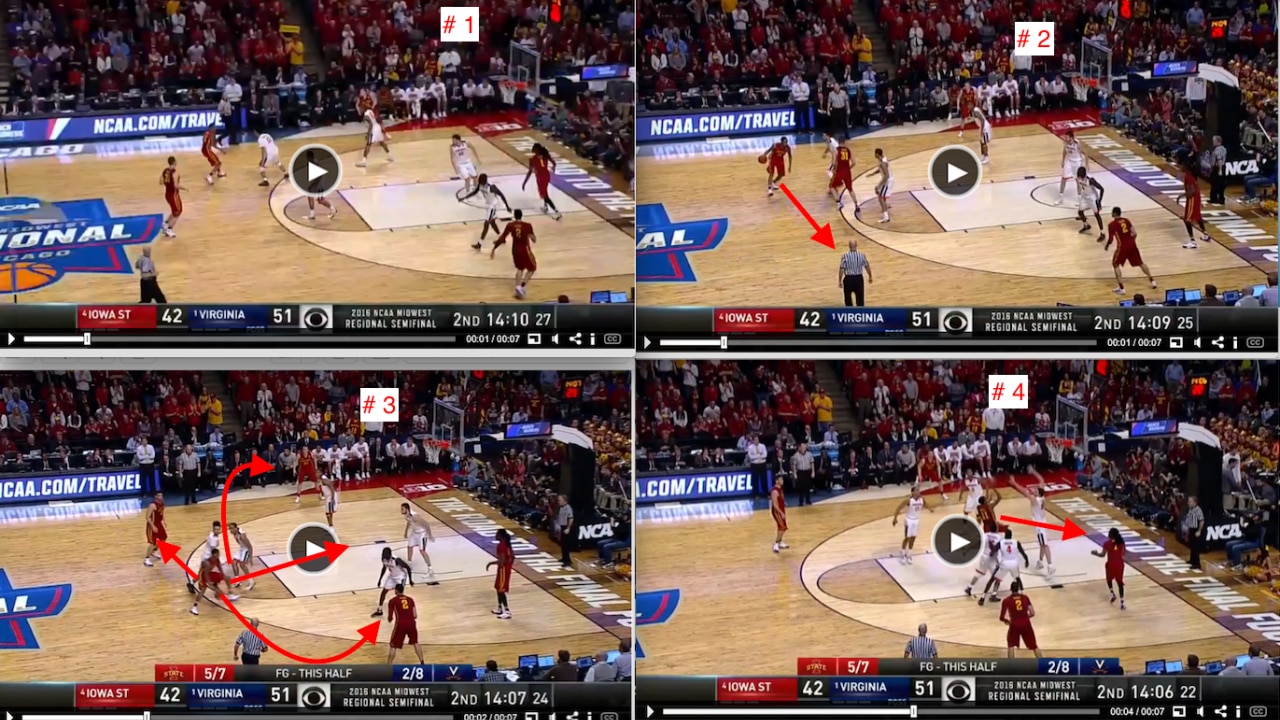 Morris’ stock and trade is his quick first step. He also has an ability to finish with both hands, in addition to what some might so endearingly call the "playground dribble". Case in point, in this example from last year’s Sweet 16 matchup against Virginia, Morris runs one of the signature features of the Iowa State attack.
