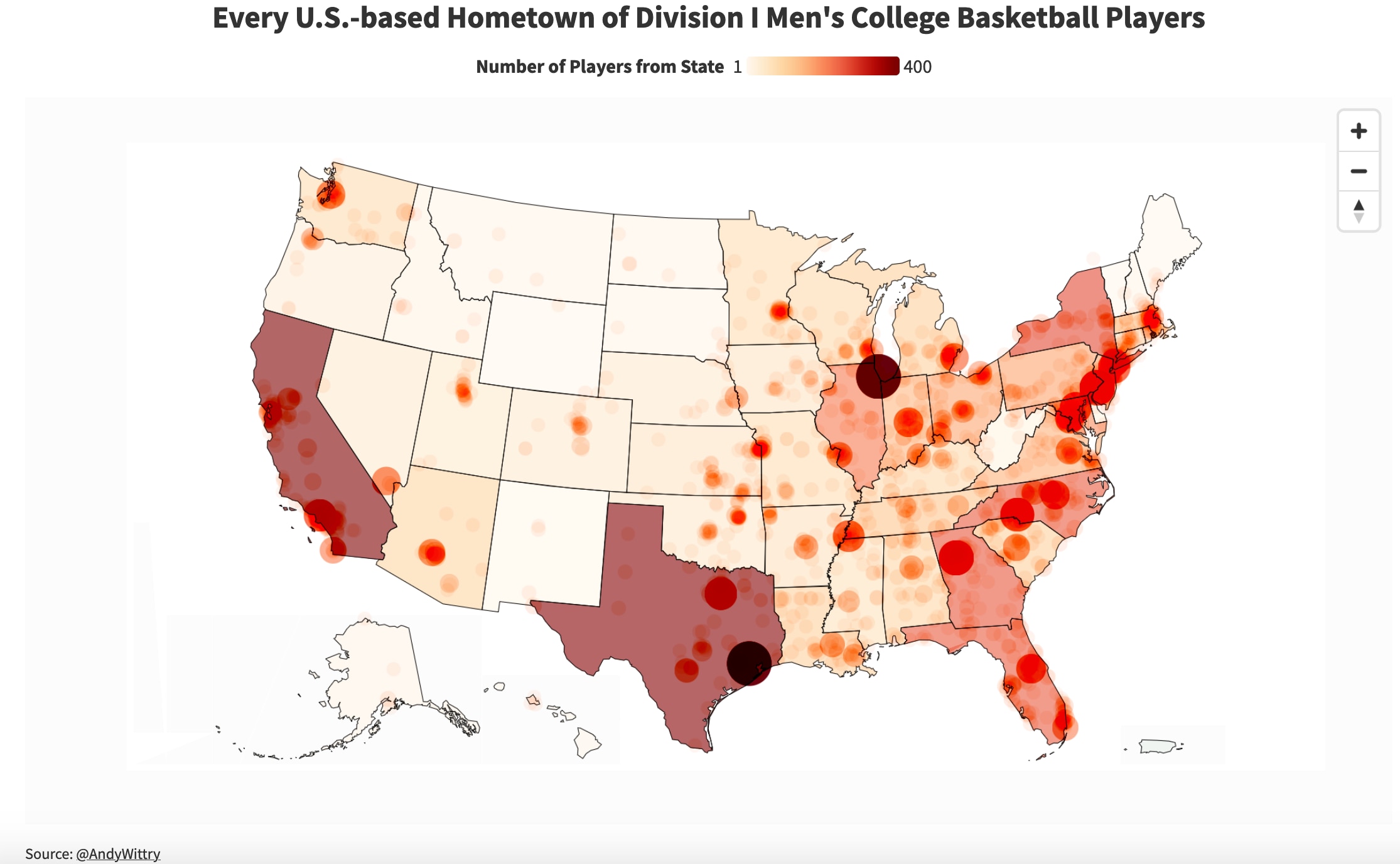 Here's a closer look at the top talent-producing cities in the U.S., with heat maps for the the U.S. cities and states that have produced the most current DI men's basketball players. .