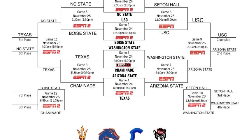 As for the women's matchups, which feature three of the 2024 Women's Final Four teams, they will play in semifinal matchups on Wednesday, Nov. 26, with the championship and third place game set for Nov. 27 on Thanksgiving Day.