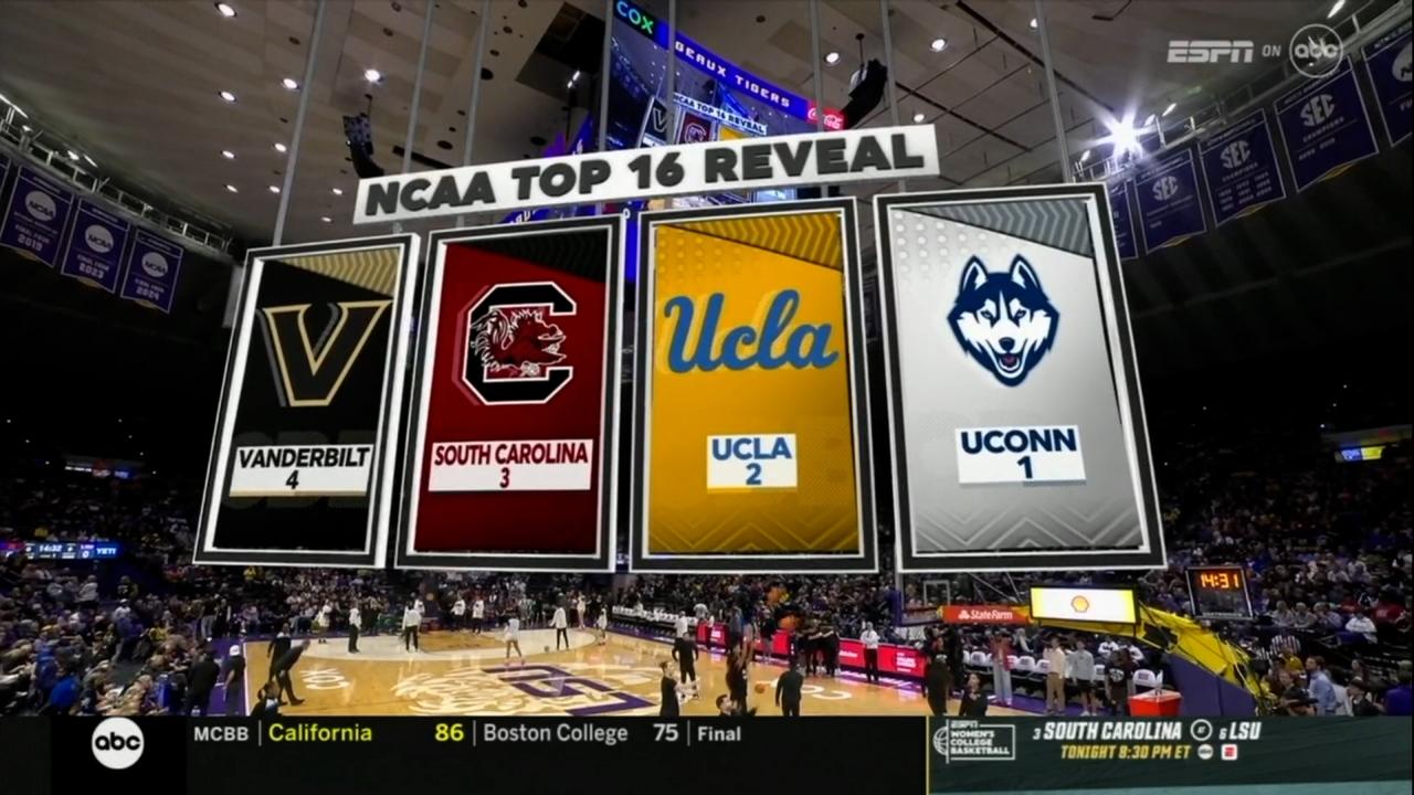 INDIANAPOLIS — The NCAA Division I Women’s Basketball Committee tabbed UConn, UCLA, South Carolina and Vanderbilt as the No. 1 seeds in its first top 16 reveal of the season.