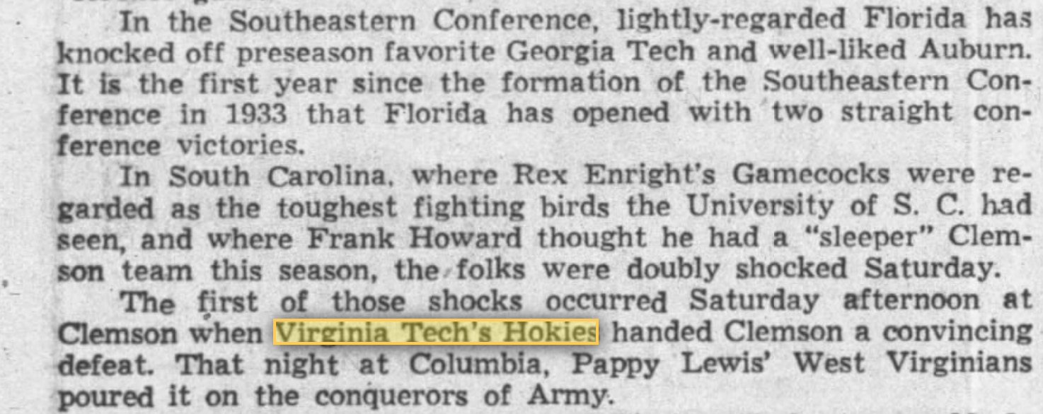 In fact, the first newspapers.com search result for the phrase "Virginia Tech Hokies" wasn't until 1954 in an issue of The Times Dispatch in Richmond, which wrote about Virginia Tech's surprising win against Clemson.