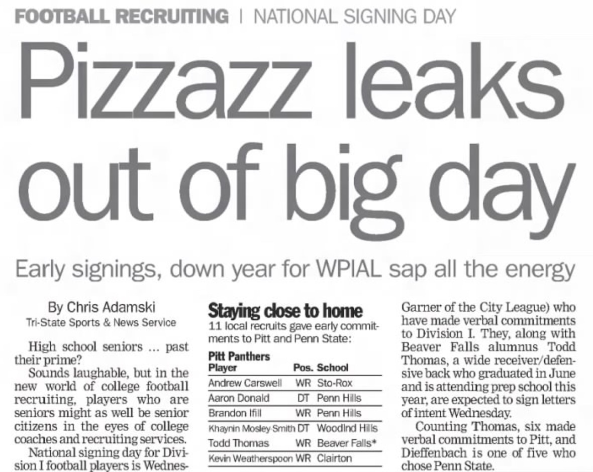 Donald told the Pittsburgh Post-Gazette (an excerpt of which is shown below) in January 2010, "I just felt like I knew what school was the best fit for me, so I was ready to commit to it. I let my coaches know, and that was about it."