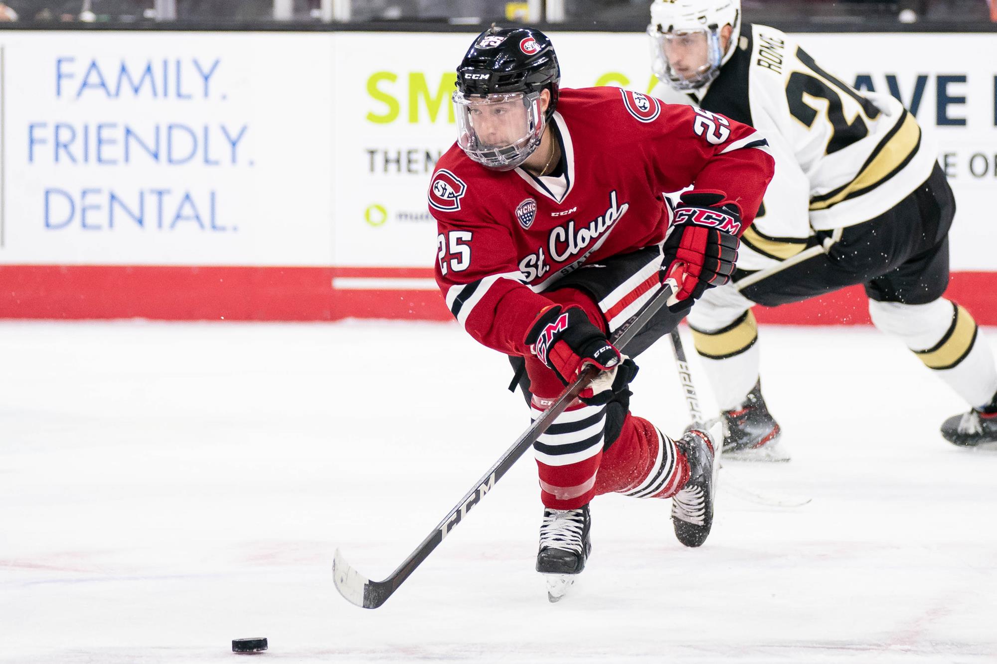 - Sam Hentges (St. Cloud State): Despite missing some time this season due to injury, Hentges has nine points in seven games. The New Brighton, Minnesota native posted four points over two games against Bemijdi State in his first weekend back from both upper and lower body injuries. As a freshman in 2018-19, he was a major contributor on the Huskies, posting 20 points. He followed that up in 2019-20 with 24 points. In 29 games last season, he posted 17 points and helped guide St. Cloud State all the way to the national championship game. He was drafted in the seventh round by the Minnesota Wild in 2018.