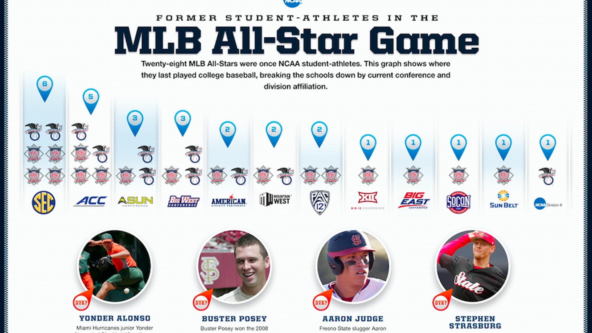 The SEC leads the field with six different representatives while the ACC follows close behind with five. The Big West (three), Atlantic Sun (three), Pac-12 (two), AAC (two), Mountain West (two) and Sun Belt (two) round out the conferences with multiple All-Stars, having two each. Minnesota Twins closer Brandon Kintzler is the lone former Division II student-athlete heading to Miami.