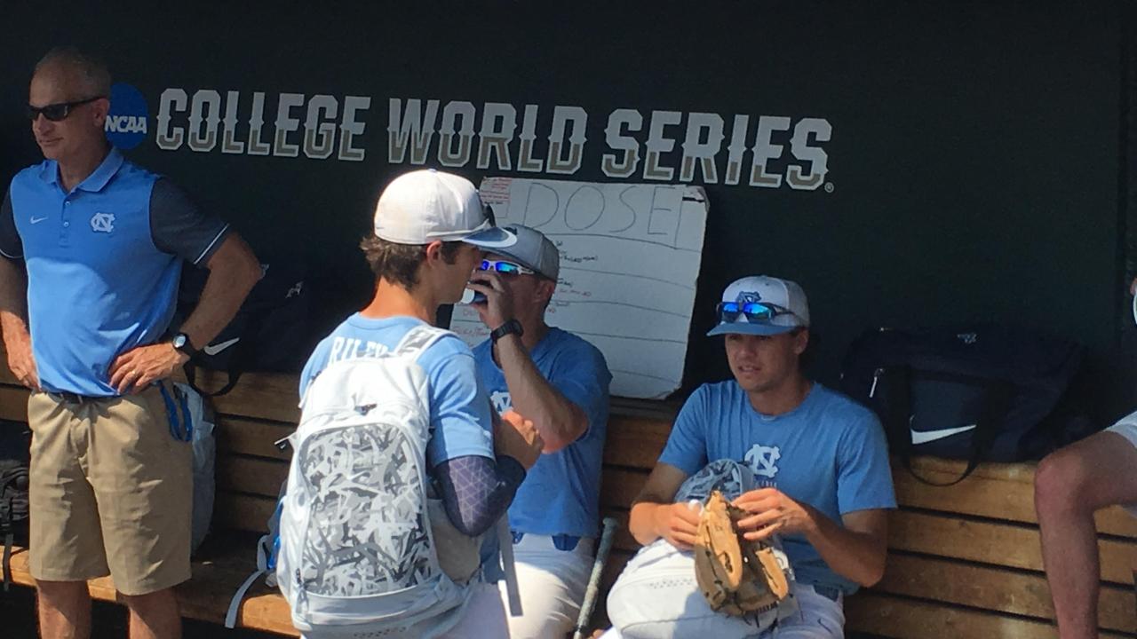 UNC's 'DOSE board' sits in the dugout during the Tar Heels' practice Friday at the College World Series.