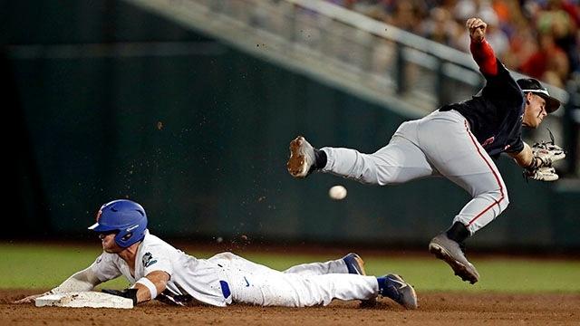 Why we love it: This is proof that baseball in a contact sport. We appreciate this awesome action shot as a reminder of the impressive quick play we saw in the College World Series. In this shot, Gators shortstop Deacon Liput takes a hard dive to steal second base, sedning Texas Tech's Michael Davis flyting trying to make a play.