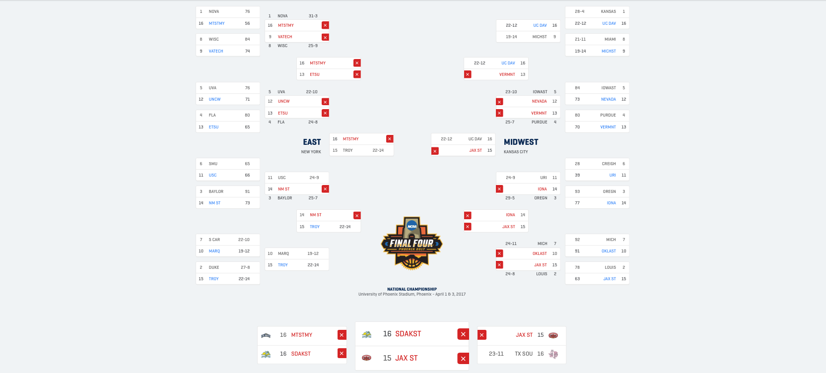 And yes, there are a few surefire ways to improve your odds of getting a perfectly wrong bracket. Seven of the nine brackets that started the tournament 0-20 had all 15 and 16 seeds winning their first-round games (reminder, 16 seeds are currently 0-130, and 15 seeds are 8-121). One bracket, , picked all the 15 and 16s except for Texas Southern, which it has losing to 1-seed UNC, and only two brackets had zero 16 seeds in their Final Fours —  and .