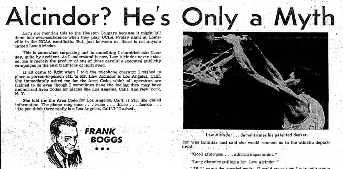 Chicago Tribune: "Did you hear about Lew Alcindor chopping down the cherry tree and then confessing to the Establishment, 'Father, I cannot tell a lie!'? Did you hear about Lew Alcindor driving the snakes from Ireland? Have you heard about Lew Alcindor, the boy, splitting rails in downstate Illinois? You probably have listened to all these tales, and more, too, because Lew Alcindor β€” star sophomore on the University of California at Los Angeles basketball team β€” is the most publicized athlete of our time."