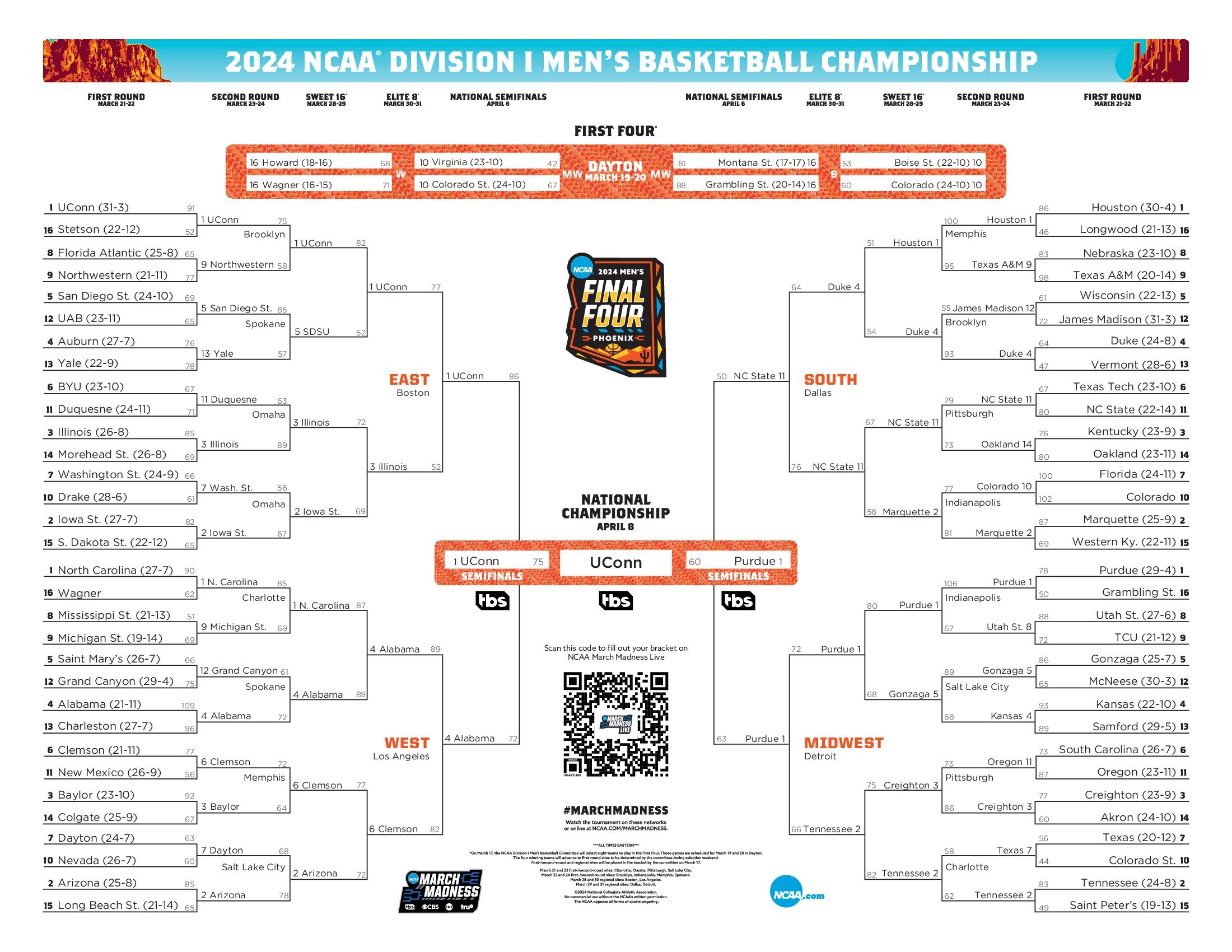 Here is the 2024 NCAA tournament bracket for March Madness