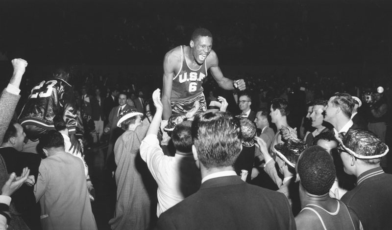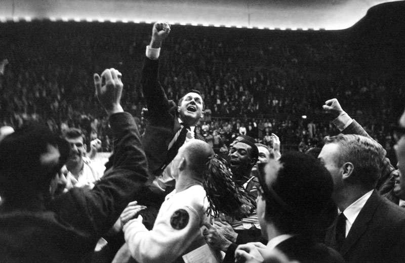 Bill Russell gets a ride off the court after San Francisco won the 1955 title game.