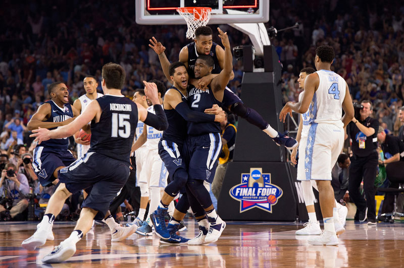 Villanova players celebrate after Kris Jenkins hit a buzzer-beating 3-pointer to win the national championship.