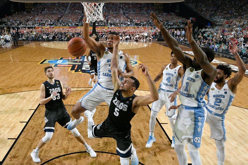 UNC senior Kennedy Meeks and Gonzaga’s Nigel Williams-Goss go up for the rebound.
