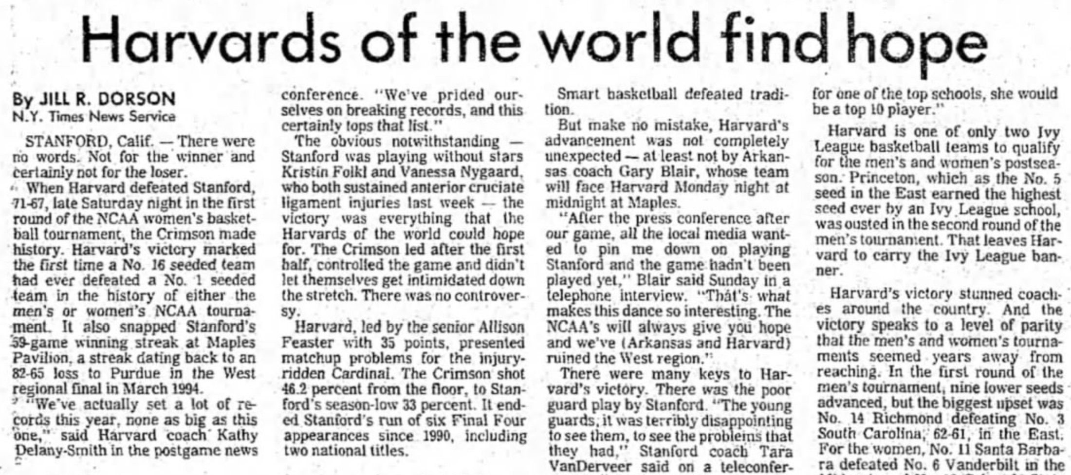 The Cardinal had taken some hits that season with five defeats, but the program was deeply respected, coming off three consecutive Final Four appearances. Stanford was a No. 1 seed on reputation, among other things. Harvard’s assignment was daunting, playing in Maples Pavilion before one of the loudest home crowds in women’s basketball. The Cardinal had won 59 games in a row there.