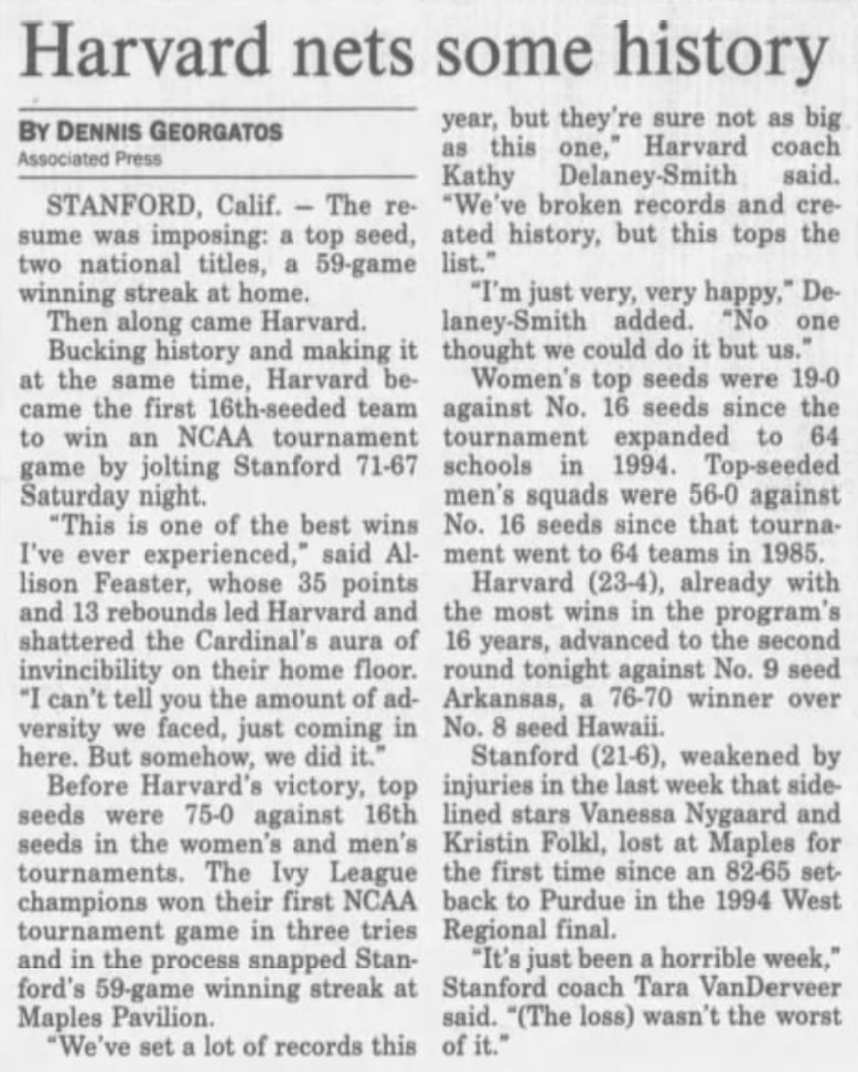 The record book shows that Harvard shocked the basketball world that day. The 71-67 victory over Stanford was the first time a No. 16 seed had ever beaten a No. 1 seed in either the women’s or men’s tournament. More than two decades later, only the UMBC men of 2018 have matched the feat when they stunned Virginia. That makes the current overall all-gender record of No. 1s in the matchup 250-2 (through the 2021 tournaments). Those were the enormously long odds the Crimson women overturned that day.