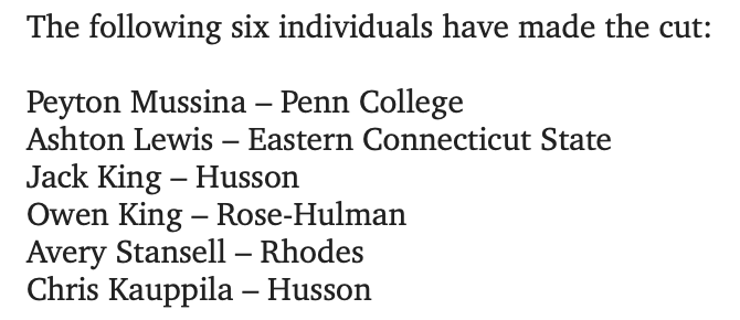 | 2006 | Nebraska Wesleyan | Brett Balak | 1,193 | Redlands | 1,203 | Nebraska Wesleyan |